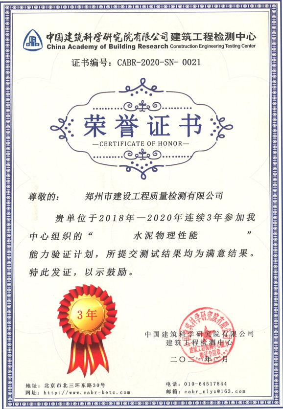 我公司于2018年—2020年連續(xù)3年參加中國(guó)建筑科學(xué)研究院有限公司建筑工程檢測(cè)中心組織的“水泥物理性能”能力驗(yàn)證計(jì)劃中,所提交測(cè)試結(jié)果均為滿意結(jié)果。2021年2月獲得中國(guó)建筑科學(xué)研究院有限公司建筑工程檢測(cè)中心頒發(fā)的榮譽(yù)證書。