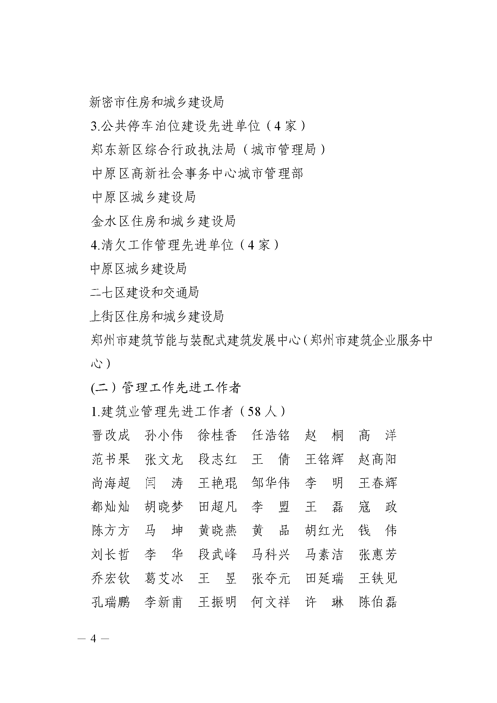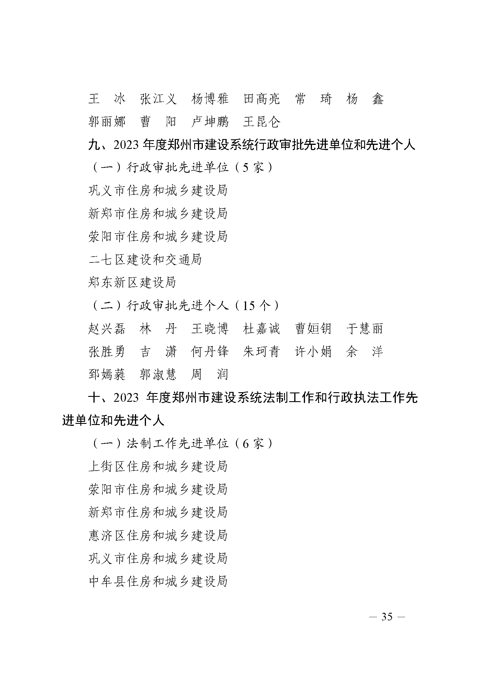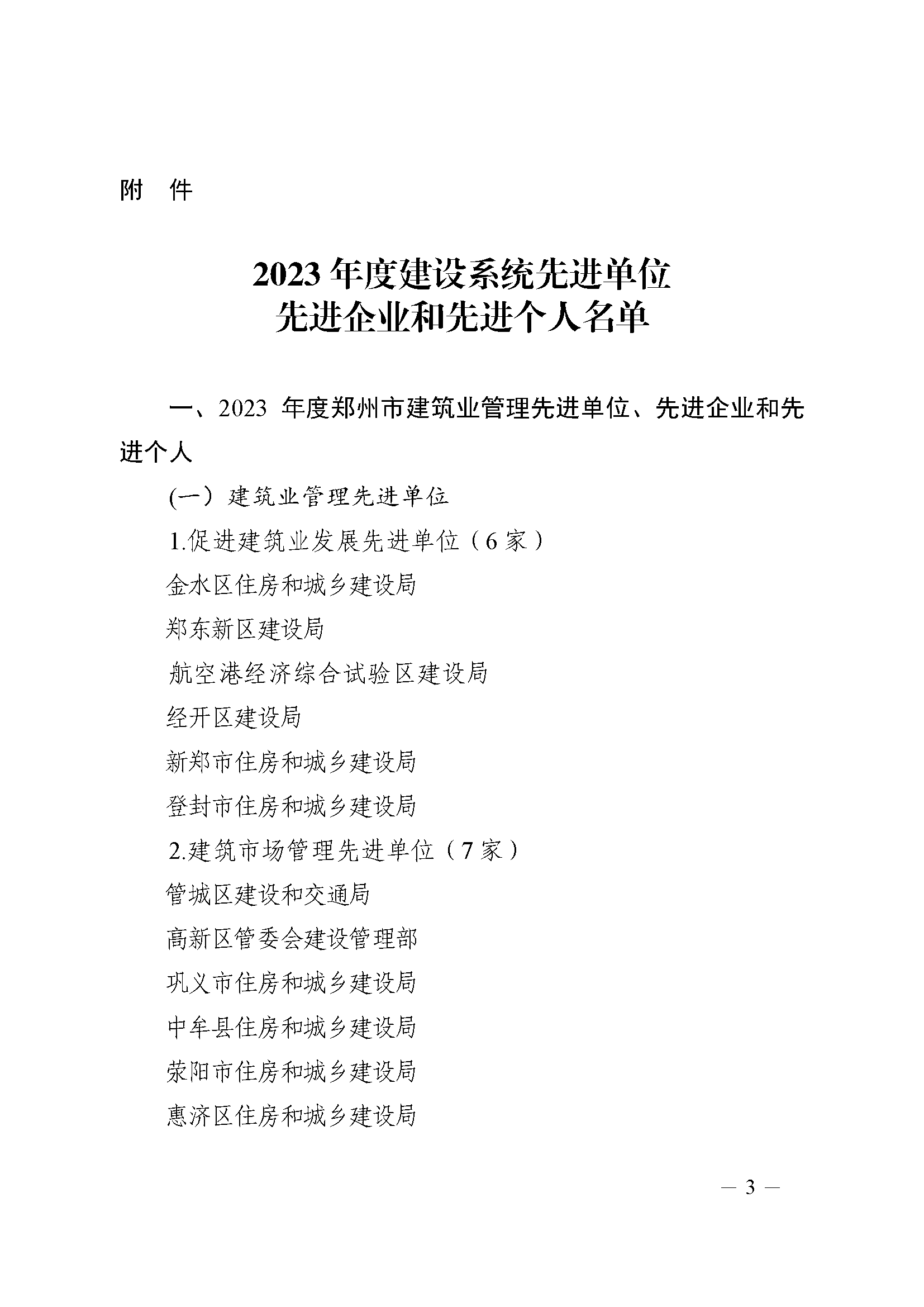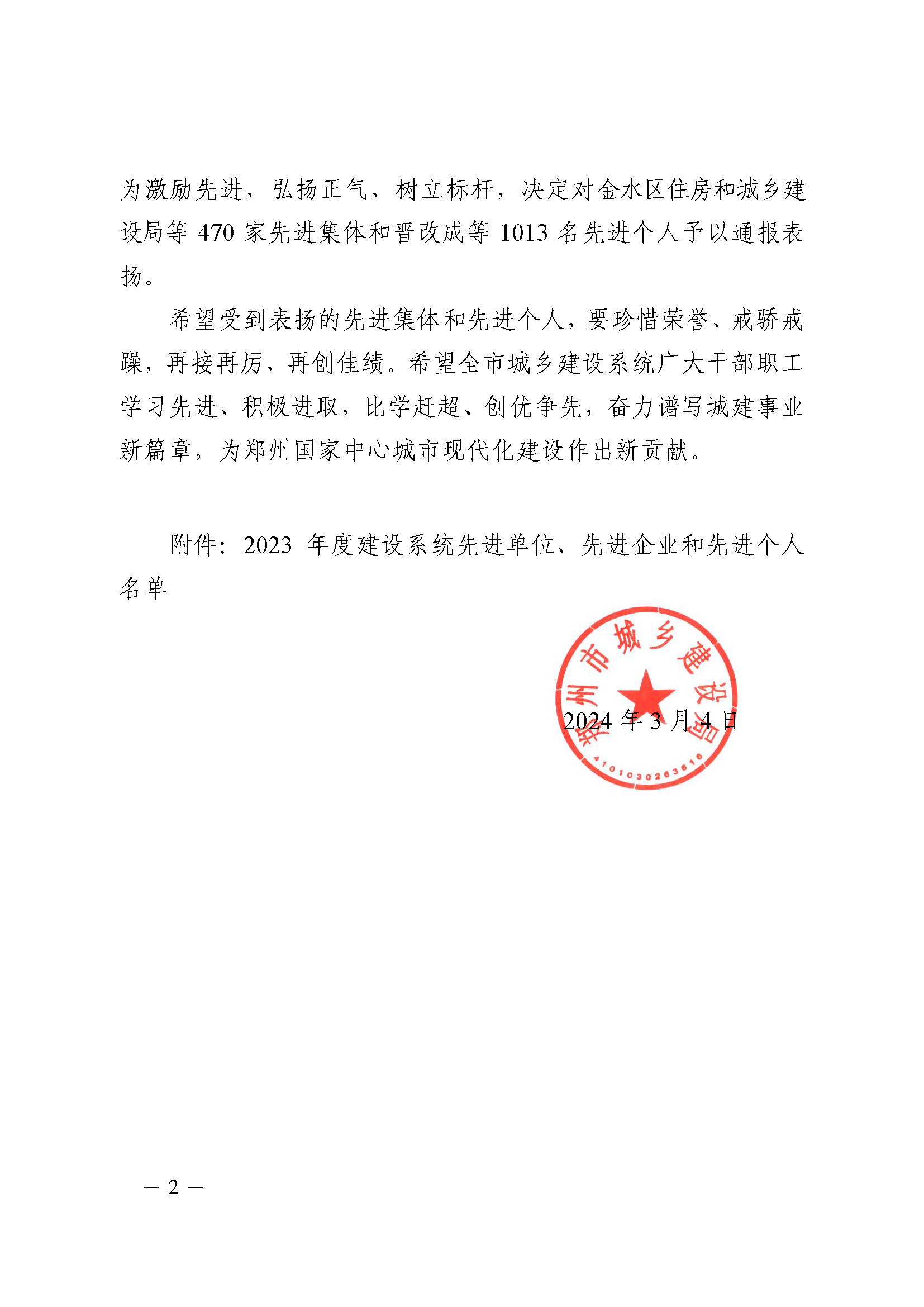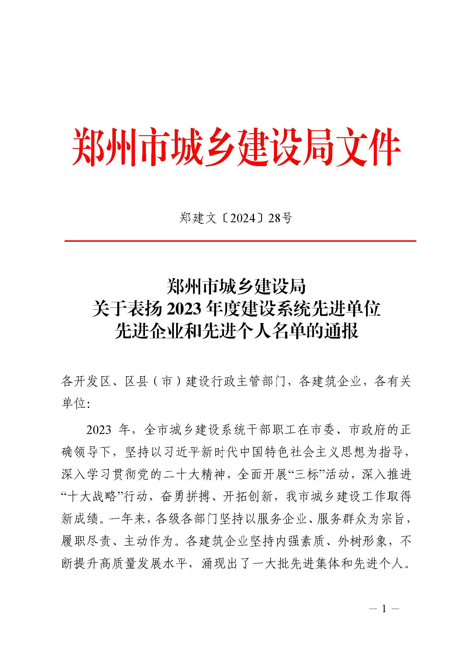 鄭州市城鄉(xiāng)建設(shè)局關(guān)于表揚2023年度建設(shè)系統(tǒng)先進單位先進企業(yè)和先進個人名單的通報