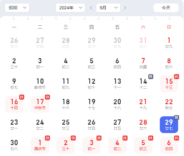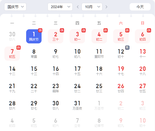 10月1日至10月7日國慶節(jié)放假調(diào)休,共7天。9月29日(星期日)和10月12日(星期六)上班。